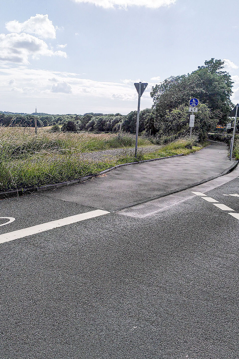 Wenn ein Radweg leicht links abzweigt, nehmen wir diesen und erreichen so die Einbahnstraße Schliemannweg, die rechts einen Radstreifen hat. Dort, wo er auf die Lichtscheider Str. mündet, biegen wir links in einen schmalen Feldweg ein.