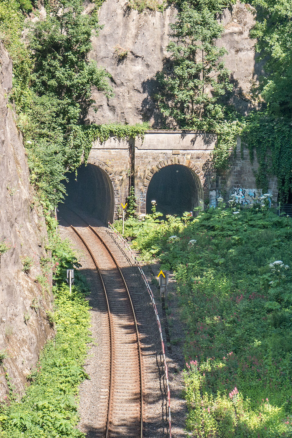 Hinter dem Wichlinghauser Bahnhof geht es rechts ab auf die Schwarzbachtrasse. Ihr folgen wir bis zu ihrem Ende, wo im BUGA+ - Konzept eine Weiterführung über die noch zu erstellende Langerfelder Trasse vorgeschlagen wird. Im Moment müssen wir aber über die Grundstr. in die Spitzenstr. fahren, überqueren später die Langerfelder/Schwelmer Str. und fahren in die Wilh.-Hedtmann-Str. Rechts über die Marbodstr. erreichen wir die Leibuschstr., der wir bis zur Bahnüberführung folgen. Blicken wir hier nach rechts, sehen wir rechts den Tunnel, aus dem die Langerfelder Trasse kommen soll.