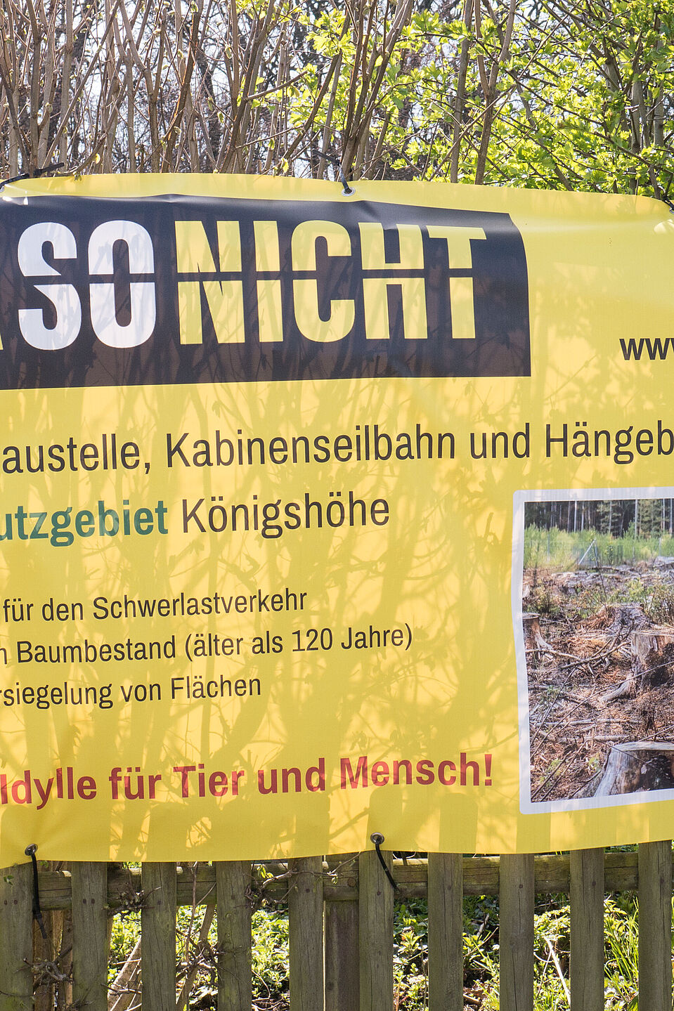 Auf der Straße Am Friedenshain überqueren wir die Cronenberger Str. und fahren in den Jung-Stilling-Weg. Am Funkturm und Aussichtspunkt Rigi Kulm haben wir einen sehr schönen Ausblick aufs Wuppertal. Wir überqueren die Rhönstr. und fahren in die Zeppelinallee, auf der wir zur Königshöhe mit vielen Kleingärten kommen. Hinter dem Restaurant weist uns ein Schild auf die Auseinandersetzung zwischen BUGA-Befürwortern und -gegnern hin.