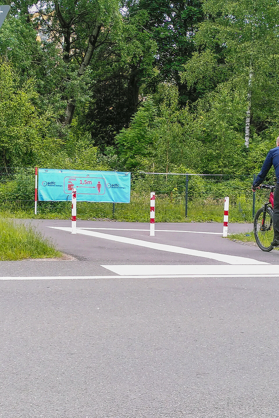Der BUGA+ Radwegring geht aber nach links weiter hoch bis zu einer Abzweigung, an der wir uns links halten und zunächst parallel zum Schmalenhofer Bach und weiter oben parallel zu Hadberger Siefen weiterfahren. An der nächsten Abbiegung geht es scharf rechts und an einer weiteren links. Wir fahren weiter hoch und lassen die Sportanlagen rechts neben uns.