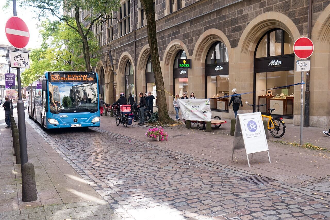 Der ADFC und Mobiles Wuppertal machten mit einer angemeldeten Veranstaltung auf die Behinderung und Gefährdung von Radfahrenden in der Friedrichstraße in Elberfeld aufmerksam. Eigentlich ist die Straße ein verkehrsberuhigter Bereich, der Bussen, Taxen und dem Radverkehr vorbehalten ist. Durch den Missbrauch als Parkraum, obwohl PKW dort überhaupt nicht fahren dürfen und absolutes Halteverbot haben, wird das gegenläufige Radfahren zu einer gefährlichen Angelegenheit: wenn Busse entgegenkommen, fehlt die Möglichkeit, an diesen vorbei zu fahren oder in Lücken auszuweichen. Beschwerden führten dazu, dass das Ordnungsamt stichprobenartig kontrollierte, aber keine Änderung herbeiführte.